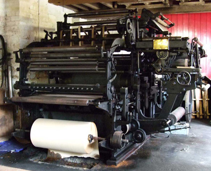 The Cossar printing machine combines the simplicity and economy of a flatbed press, with the convenience of printing direct from type onto a reel of newsprint. It used the existing skills and typesetting equipment available in every letterpress printers, but was reel- instead of sheet-fed, and used a system of compensating rollers to solve the problem of combining an intermittent printing action (the impression cylinder stopping after each impression to allow the reciprocating printing bed to return) and continuous web conversion (folding, slitting). The machine’s technology was ahead of its time and remains a startling and unusual solution to the problem. It made small circulation local papers viable with a technology which remained unchallenged for fifty years: they were produced until 1968 by Dawson, Payne and Elliott.